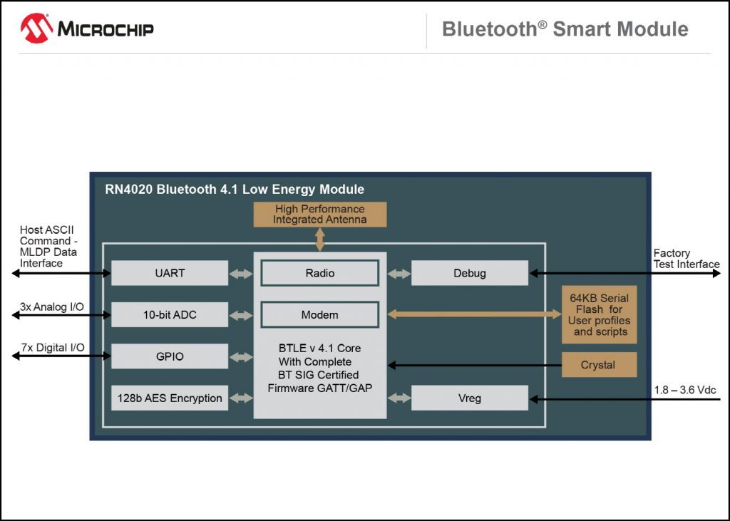 마이크로칩의 RN4020 블루투스 LE 스마트 모듈은 모든 설계에 저전력 연결을 손쉽게 추가할 수 있으며 QDID 블루투스 호환성 테스트를 통한 EPL(End Product Listing) 절차를 용이하게 하기 위한 모든 하드웨어, 소프트웨어 및 인증이 포함되어 있다. 또한 이 모듈에는 마이크로칩의 유연한 MLDP 및 블루투스 SIG 저-에너지 공통 프로파일을 포함한 모든 프로그래머블 프로파일이 저장되어 있으며 이를 모듈 상에서 선택할 수 있다. 공통 퍼블릭 프로파일뿐 아니라, ASCII 명령 인터페이스를 통해 프라이빗 서비스도 생성할 수 있다. 이 밖에도 RN4020은 7 데시벨미터(dBm)의 송신 전력과 -92.5dBm의 수신 민감도를 갖는 내장 PCB 안테나를 제공한다. 이를 통해 11.5 x 19.5 x 2.5 mm 크기의 소형 폼팩터에서 100 미터[1] 이상 거리에서의 동작이 가능하다.