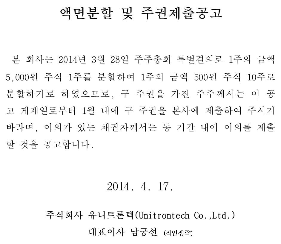 액면분할 및 주권제출공고 4월 17, 2014 Posted by: Unitrontech Category: 결산공고 댓글 없음 2014. 04.17 액면분할 및 주 제출공고 Share 제품에 대한 궁금증이 있으신가요? 제품문의를 이용해 보세요! 제품 문의하기