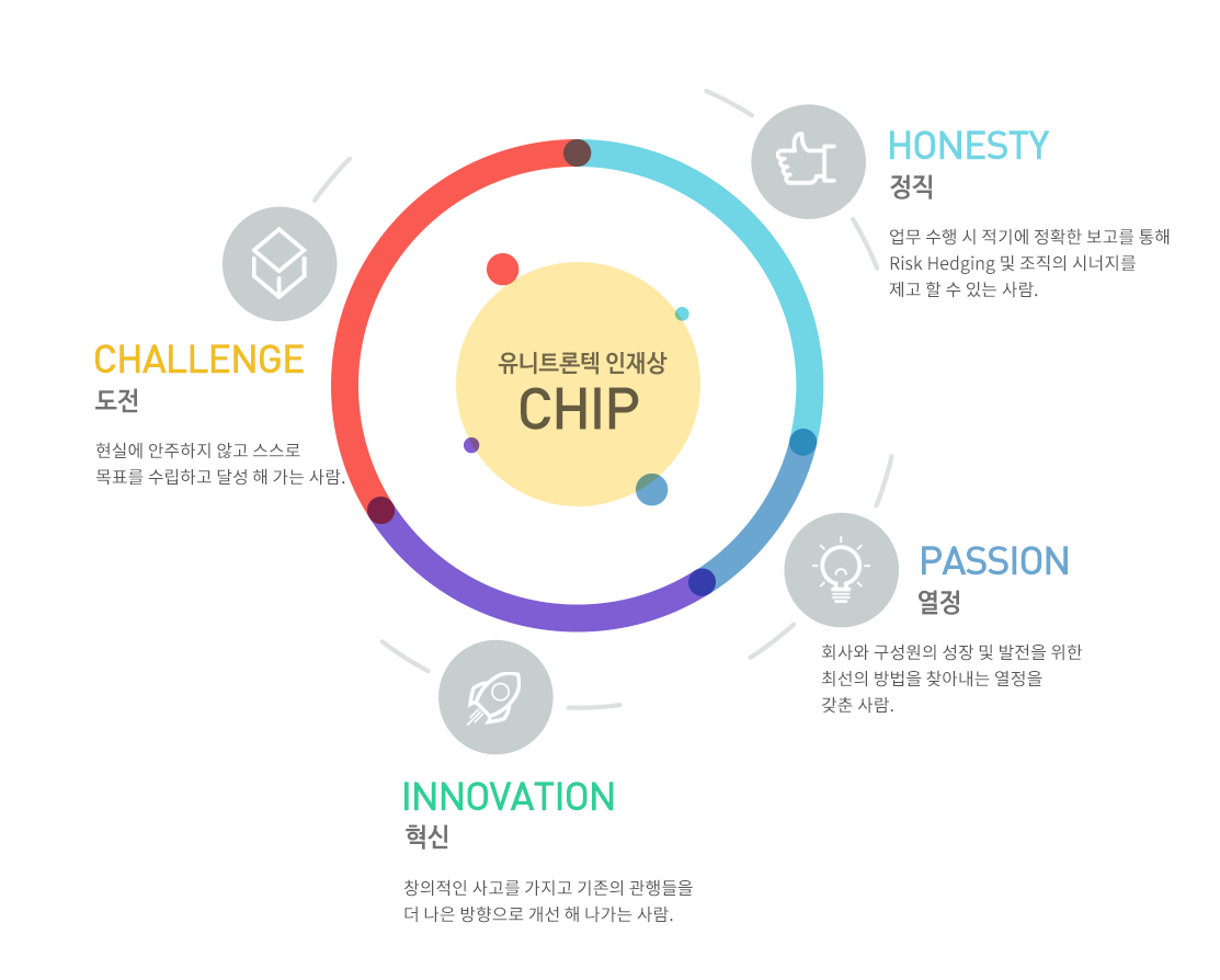 유니트론텍의 인재상 유니트론텍은 도전적이며, 정직하고, 혁신적이며, 열정이 가득한 인재를 원하고 있습니다. [CHIP 정신을 가진 인재] 제품에 대한 궁금증이 있으신가요? 제품문의를 이용해 보세요! 제품 문의하기